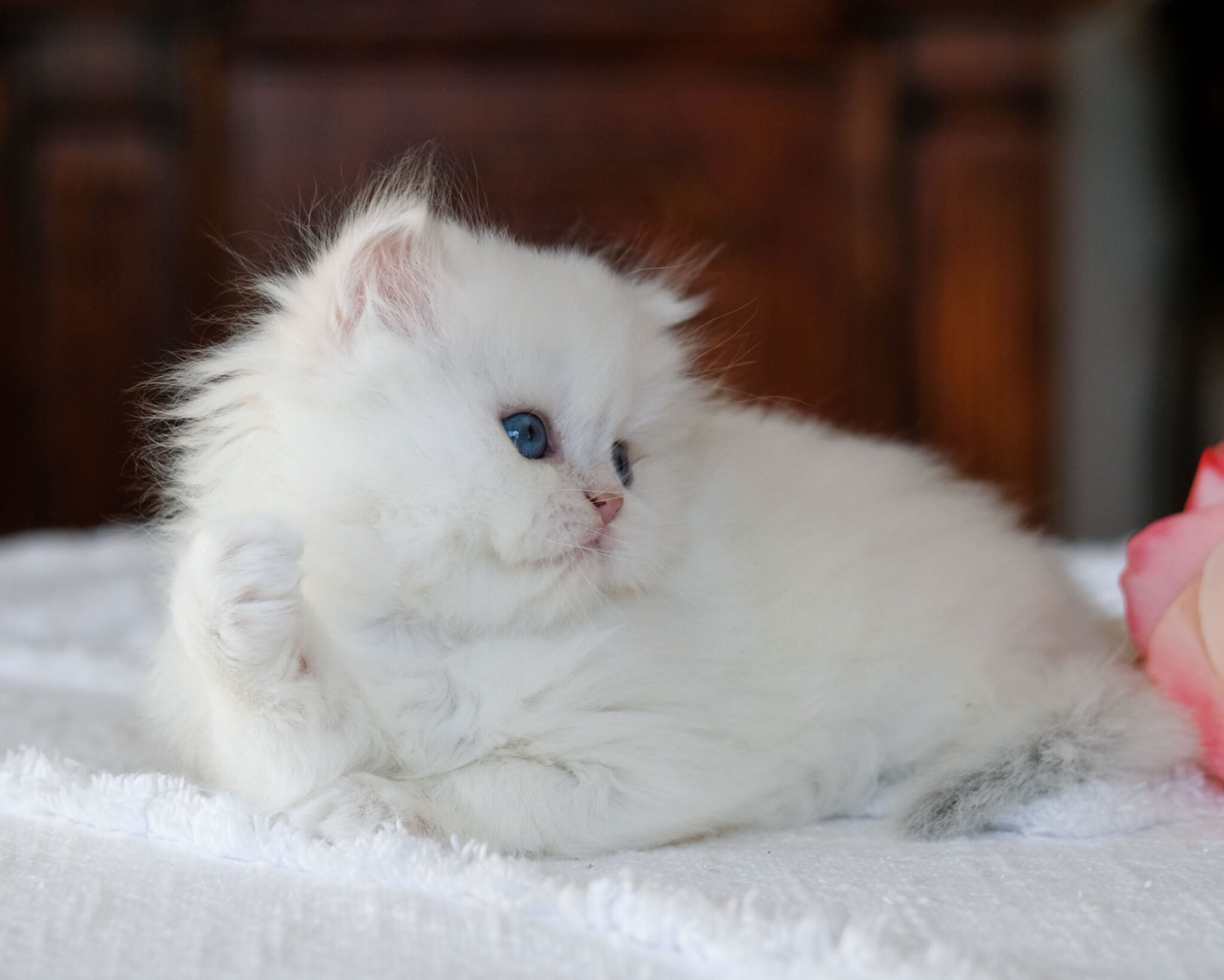 He moves with grace, almost gliding when he walks, and loves to settle near his people once he finds a comfortable spot. Frosty enjoys quiet company, gentle grooming, and moments of affection. His easy-going personality and quiet intelligence make him a wonderful match for those who appreciate a companion that is as beautiful as he is kind.